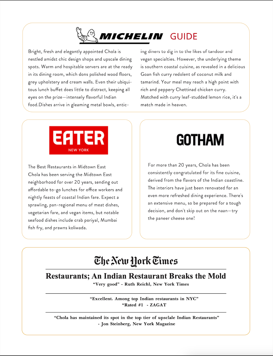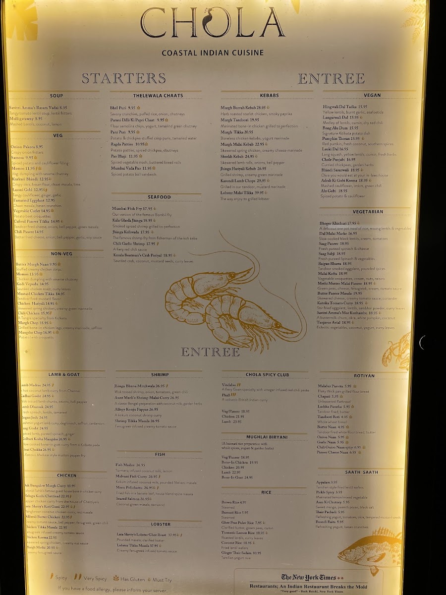 The Chola Menu offers a vibrant array of traditional Indian dishes with a modern twist, perfect for any occasion. Located at 232 E 58th St, New York, NY, this spot is a true gem for those craving rich, flavorful meals. From creamy curries to tandoori delights, every dish is crafted using the freshest ingredients, with attention to both authenticity and creativity. Whether you're a fan of spicy, savory, or subtly sweet, there's something here for every palate. The menu features everything from hearty biryanis to light yet satisfying appetizers, each designed to give you a taste of India's diverse culinary heritage. Whether dining in or ordering for delivery, the Chola Menu never fails to impress.